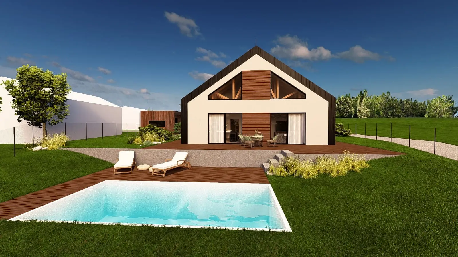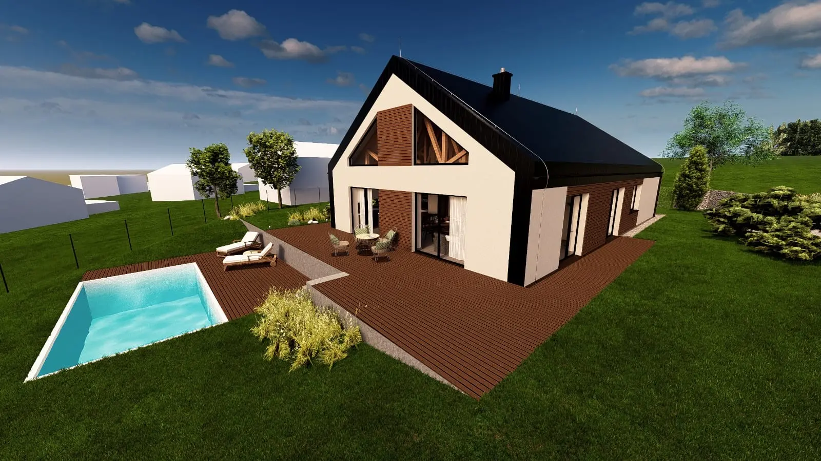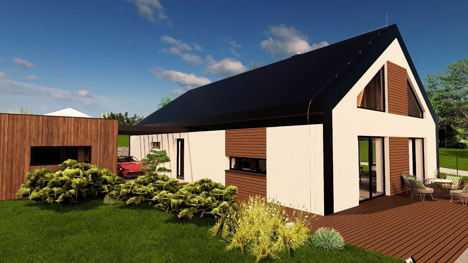 - Fasáda v kombinaci bílé a dřevodekoru, černá sedlová střecha
