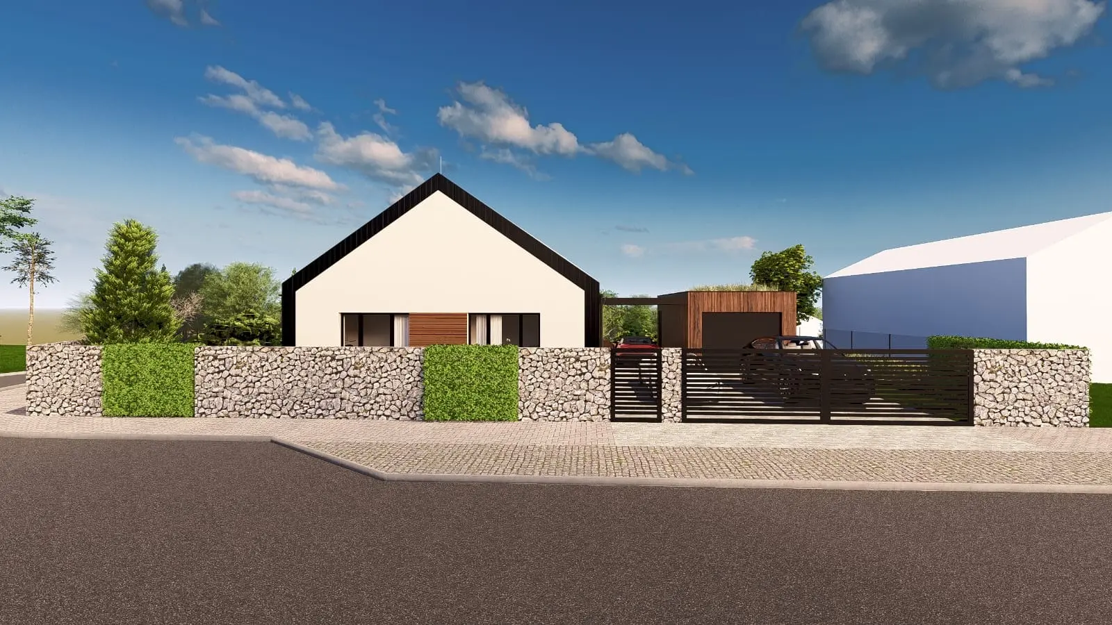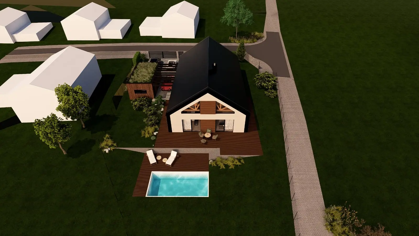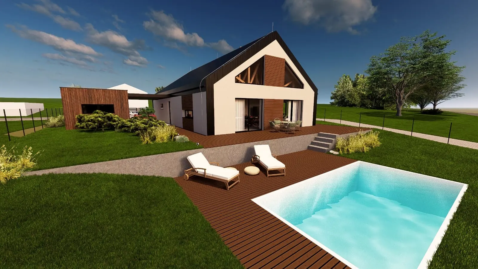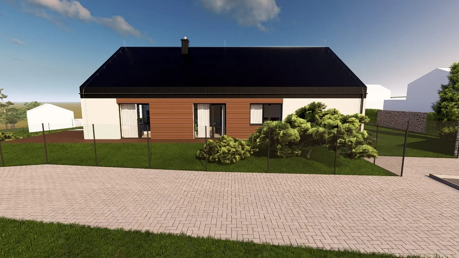 - Fasáda v kombinaci bílé a dřevodekoru, černá sedlová střecha