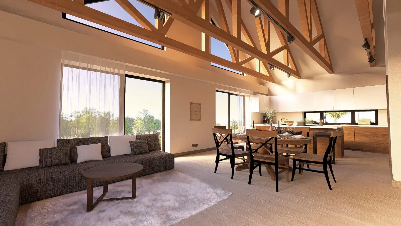Dominantou domu je velkorysý obývací prostor s viditelnými dřevěnými vazníky, velkoformátovými prosklenými okny a přímým vstupem na zahradu.