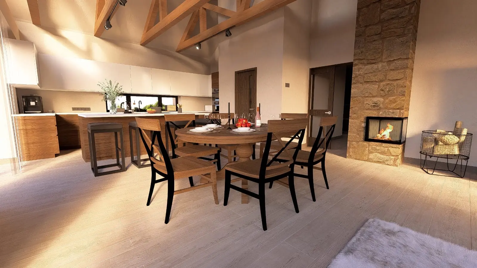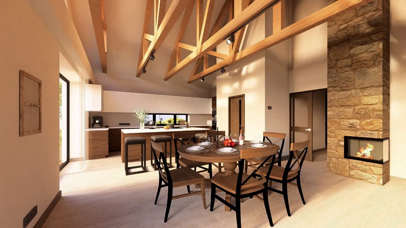 Dominantou domu je velkorysý obývací prostor s viditelnými dřevěnými vazníky, velkoformátovými prosklenými okny a přímým vstupem na zahradu.