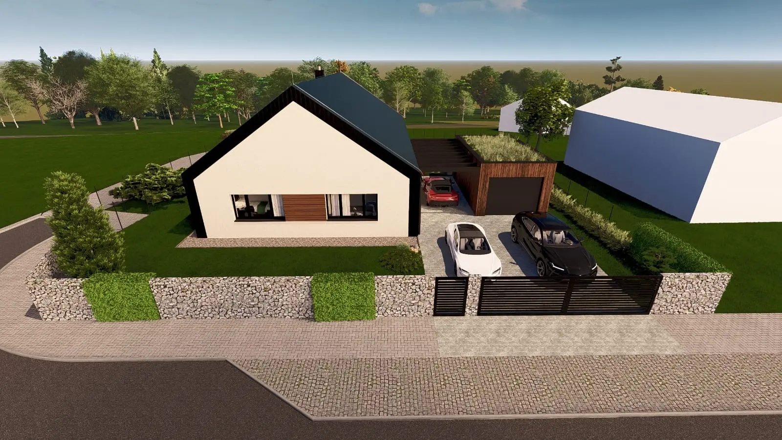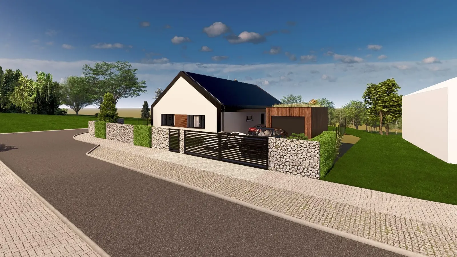 - Fasáda v kombinaci bílé a dřevodekoru, černá sedlová střecha